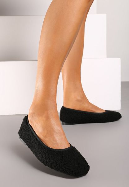 Czarne Płaskie Balerinki Ozdobione Futerkiem o Fakturze Barankiem Armagia