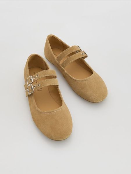 Buty typu baleriny wykonane z zamszu.