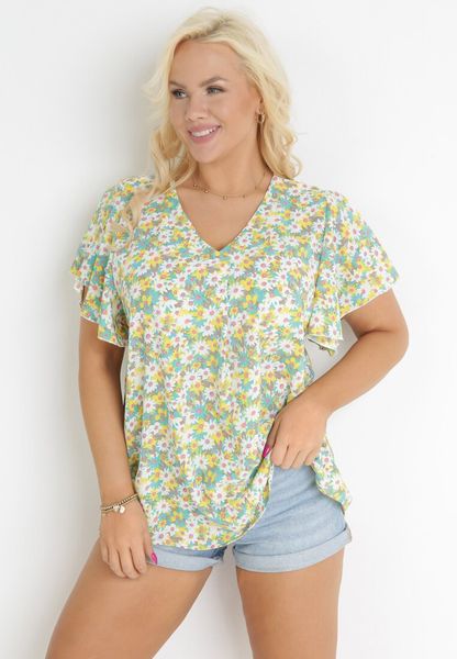 Żółta Bluzka w Kwiaty z Trójkątnym Dekoltem i Krótkim Rękawem Lillas