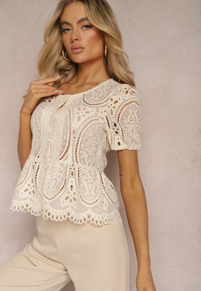 Jasnobeżowa Koronkowa Bluzka z Guzikami Wisterria