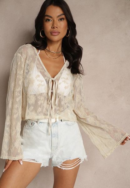 Beżowa Koronkowa Bluzka z Bawełną i Wiązaniem Elniran