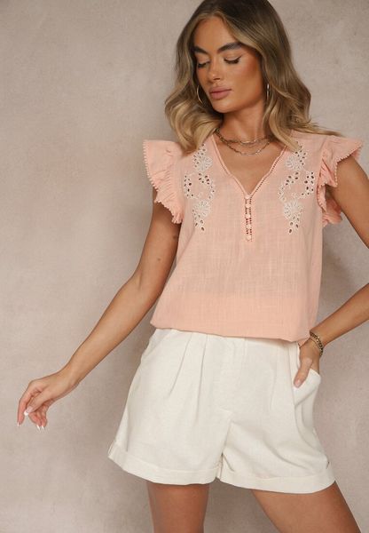 Różowa Bluzka z Bawełny z Haftowanymi Zdobieniami i Falbanką Talanea
