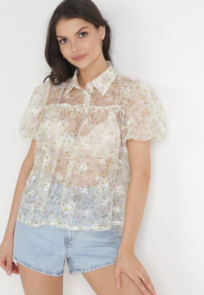 Dwuwarstwowa bluzka Pakla wykonana z siateczkowego materiału z motywem kwiatków. Zapinana na dwa guziki przy kołnierzu. Model z krótkimi rękawami. Idealna na wiosnę i lato.