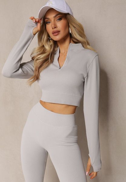 Jasnoszara Elastyczna Bluzka na Suwak z Wycięciem przy Ściągaczu Denalla