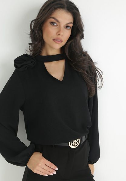 Bluzka Gomi z ozdobnym wycięciem pod dekoltem. Zapinana z tyłu na guzik. Długie rękawy ze ściągaczami. Bluzka Gomi posiada po prawej stronie na górze dekoracyjny kwiat.