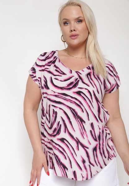 Biało-Fioletowa Bluzka z Wiskozy z Ozdobnym Wycięciem na Plecach i Krótkim Rękawem Jeleviana
