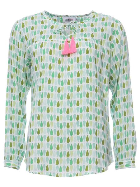 – czysta wiskoza- dekolt: okrągły- zakończenie rękawów: mankiet na guzik – detale: ozdobne wiązanie- krój: prosty- wzór: na całości