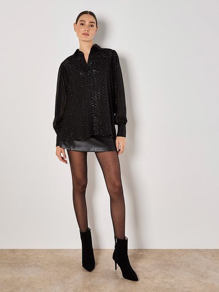 – kołnierz: kent- dekolt: V- zapięcie: listwa guzikowa- krój rękawów: bufiasty- zakończenie rękawów: guziki- detale: połyskująca nitka- krój: luźny- wzór: na całości
