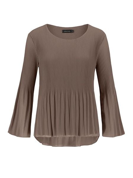 – dekolt: okrągły- krój rękawów: rozszerzany do dołu- detale: plisy- krój: prosty- look: jednokolorowy