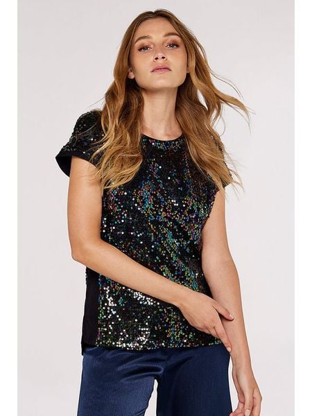 – dekolt: okrągły- detale: cekiny- krój: prosty- look: jednokolorowy