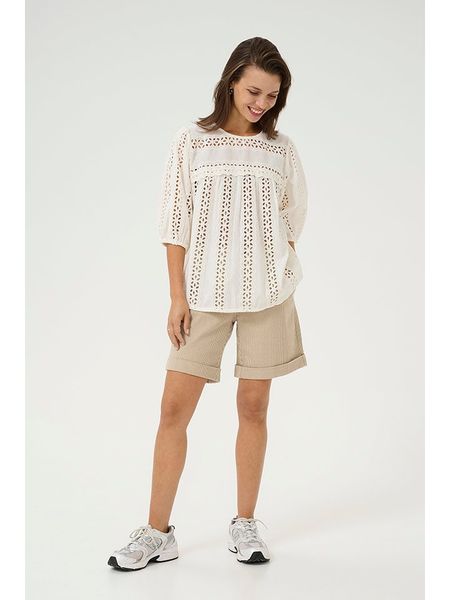 – czysta bawełna- dekolt: okrągły- zapięcie: guzik na plecach- rękaw: bufiasty- długość rękawa: 3/4- krój: luźny- wzór: dziurkowany