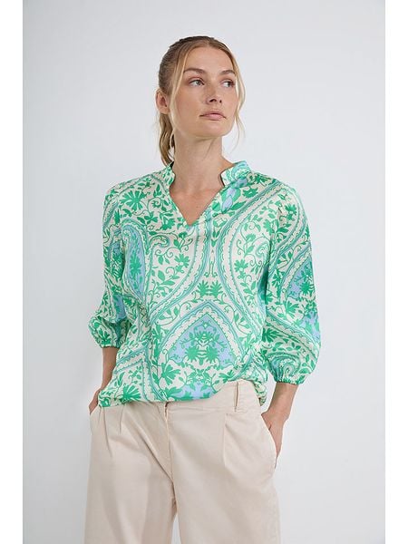 – czysta wiskoza- kołnierz: stójka- dekolt: V- zakończenie rękawów: elastyczne- rękaw: bufiasty- długość rękawa: 3/4- krój: prosty- dolny brzeg: zaokrąglony- wzór: na całości