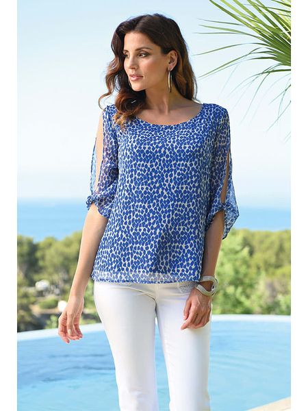 – dekolt: łódka- detale: wycięcia- krój: prosty- wzór: na całościWskazówka: Na metkach odzieży tej marki znajdują się rozmiary francuskie. Rozmiarówka została przez nas przeliczona. Podane do wyboru warianty rozmiarów odpowiadają standardowym europejskim rozmiarom konfekcji. Prosimy zapoznać się z zamieszczonym objaśnieniem rozmiarów.