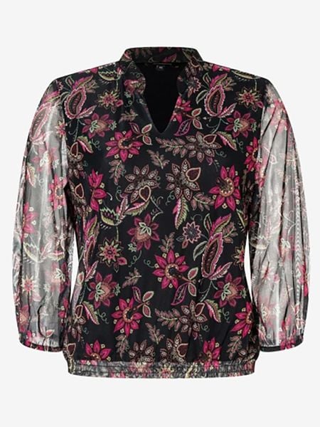 – kołnierz: stójka- dekolt: z rozcięciem- rękaw: bufiasty- zakończenie rękawów: elastyczne- długość rękawa: 3/4- dolny brzeg: elastyczny- krój: prosty- wzór: kwiatowy- wykończenie: delikatnie prześwitujące
