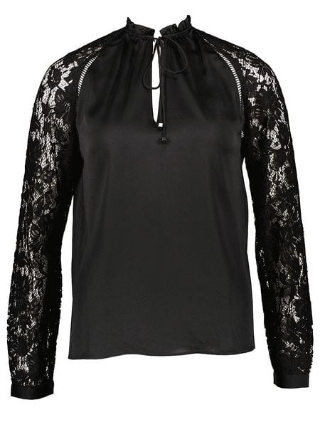 – kołnierz: stójka- dekolt: łezka- zakończenie rękawów: mankiet na guzik- detale: ozdobne wiązanie, koronki- krój: prosty- look: jednokolorowy- wykończenie: delikatnie prześwitujące