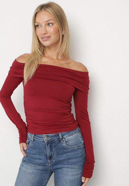 Bordowa Drapowana Bluzka VICES z Odkrytymi Ramionami i Siateczkowymi Rękawami Atevite
