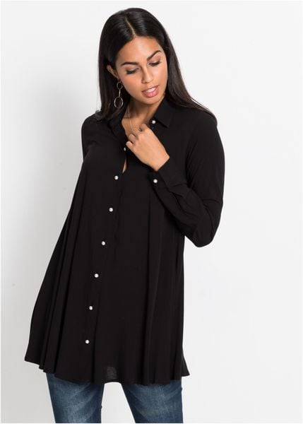 Luźniejsza bluzka w dłuższym fasonie z ozdobnymi perełkami. Elegancka długa bluzka z dekoltem w serek i plisą guzikową z perełkami. Fason delikatnie poszerzany dołem. Dł. w rozm. 38 ok. 80 cm.