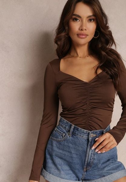 Brązowa Bluzka z Marszczeniem i Długim Rękawem Dephyllis