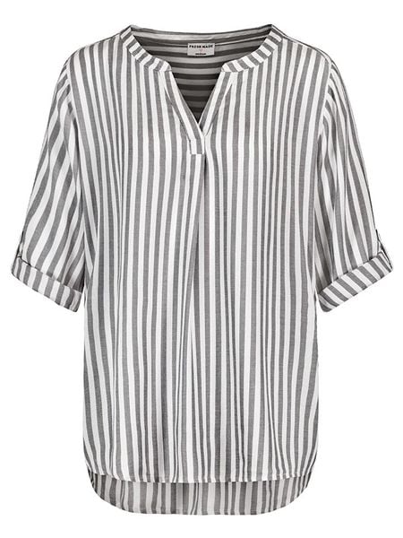 – czysta wiskoza- dekolt: z rozcięciem- zakończenie rękawów: patka i guzik- długość rękawa: 3/4- dolny brzeg: zaokrąglony- krój: luźny- wzór: paski
