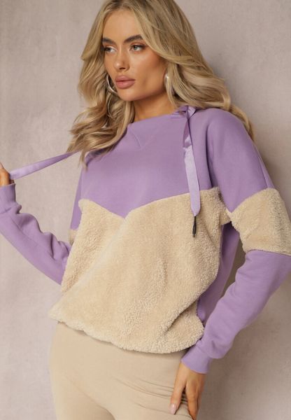 Jasnofioletowa Bawełniana Bluza z Kapturem ze Ściągaczami i Polarem Eurynia