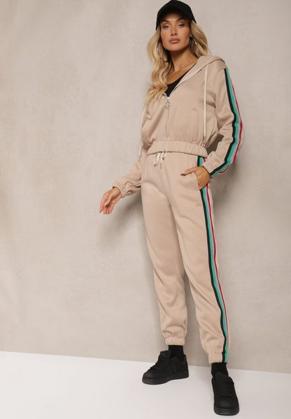 Beżowy Komplet Dresowy Zdobiony Kolorowym Lampasem Spodnie i Bluza z Kapturem Neviantha