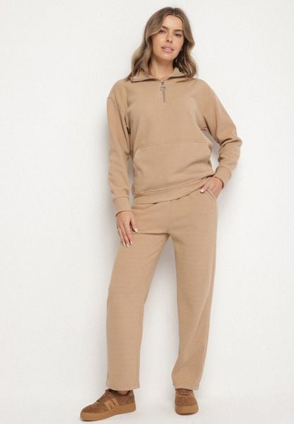 Ciemnobeżowy Ocieplany Komplet Dresowy z Bawełny Bluza z Suwakiem i Spodnie Miretila