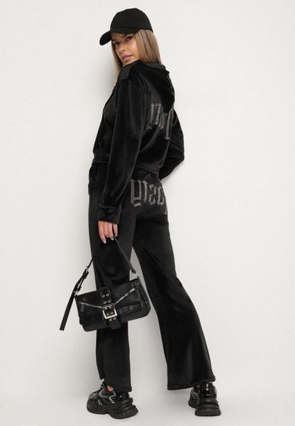 Czarny Welurowy Komplet Dresowy z Cyrkoniową Aplikacją Bluza i Spodnie Mitene