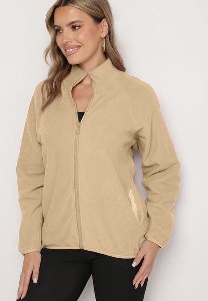 Beżowa Bluza na Suwak o Prostym Kroju ze Stójką i Kieszeniami Esamira