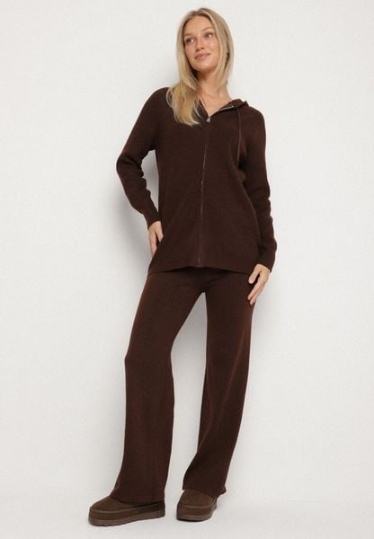 Brązowy Komplet Dzianinowy z Wełną Bluza z Kapturem i Szerokie Spodnie Otisela