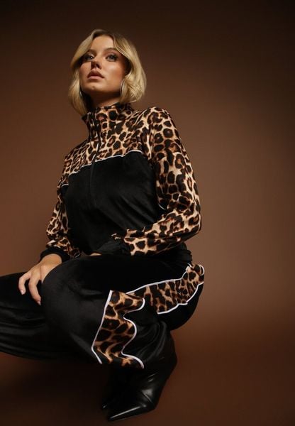 Czarny Welurowy Komplet Dresowy Spodnie i Bluza z Panterkowym Printem Koratess