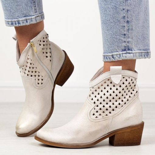 Złote skórzane Polskie botki damskie, wiosenne kowbojki ażurowe na obc