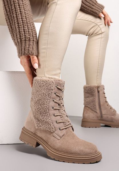Beżowe Botki Workery z Ozdobnym Futerkiem Sinuas