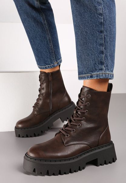 Brązowe Botki Workery na Grubej Podeszwie ze Sznurowaniem Sailia