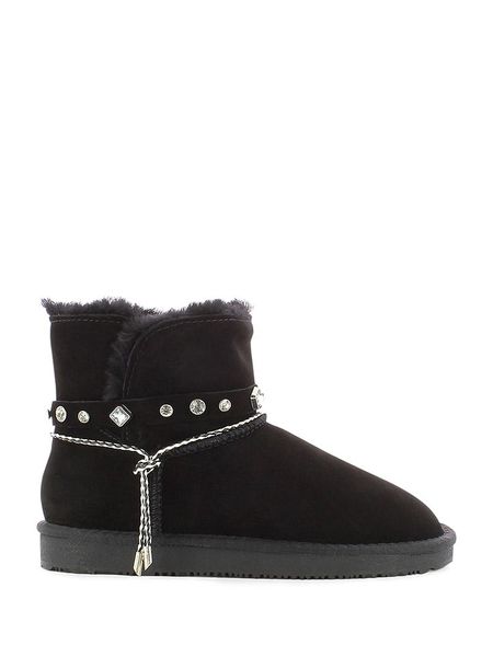 – skóra welurowa- zapięcie: bez- noski: zaokrąglone- zapiętki: wzmocnione- detale: ozdobne kamyczki – wyściółka: ogrzewający materiał tekstylny i wełna owcza – skórzana wkładka: tak- podeszwa: antypoślizgowa
