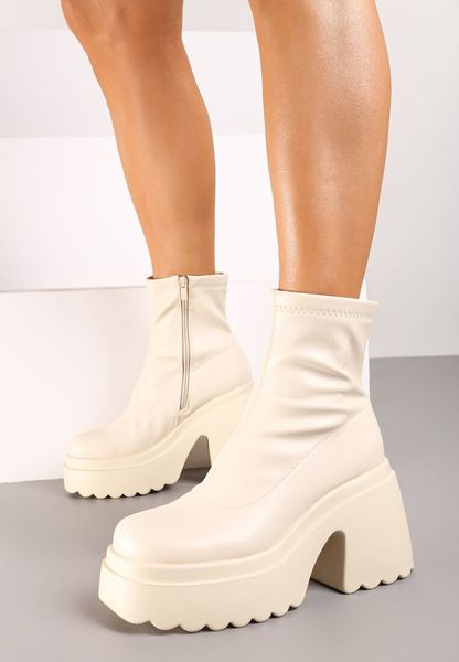 Beżowe Botki na Obcasie i Platformie z Dopasowaną Cholewką Zapinane na Suwak Reliefra