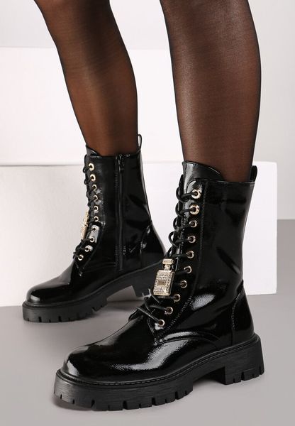 Czarne Botki Workery Lakierowane na Platformie z Aplikacją na Sznurówkach Lerienne