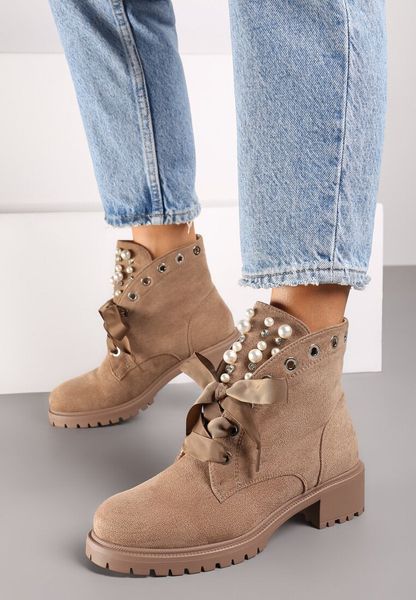 Ciemnobeżowe Botki z Ozdobnymi Sznurówkami Perłami i Cyrkoniami Jovilda