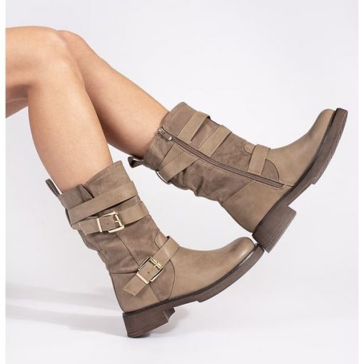 Beżowe botki damskie na niskim obcasie z klamrami beżowy