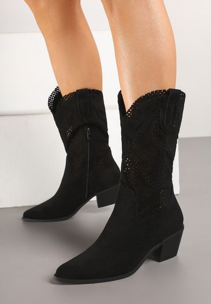 Czarne Botki Kowbojki na Słupku z Ażurową Cholewką Felmira