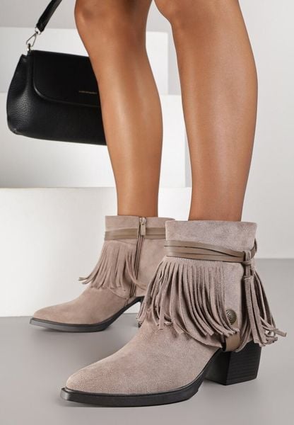 Beżowe Botki Typu Kowbojki na Stożkowym Obcasie z Frędzlami Omvila