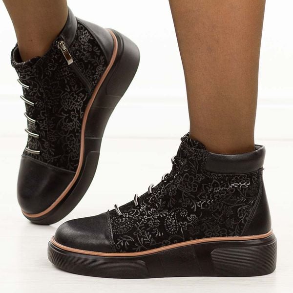 Czarne skórzane botki damskieto stylowe i praktyczne obuwie idealne na chłodną jesień oraz zimę. Wykonane ze skóry naturalnej, prezentują się niezwykle elegancko i nowocześnie. Cholewka ozdobiona została metalicznymi blaszkami które nadają butom wyjątkowego charakteru i kobiecego akcentu. Botki są zapinane na suwak, co zapewnia wygodne zakładanie i perfekcyjne dopasowanie do stopy. Okrągły nosek gwarantuje komfort nawet […]