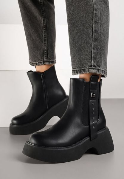 Czarne Botki Sztyblety na Platformie z Metalicznymi Zdobieniami przy Cholewce Tulirina