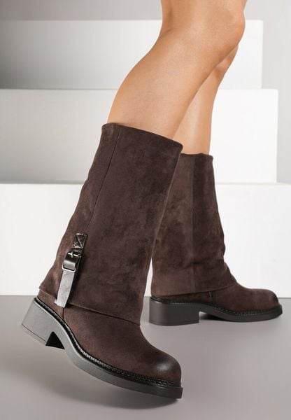 Brązowe Botki z Cholewką Imitującą Nogawkę Zdobione Paskiem ze Sprzączką Tirelie