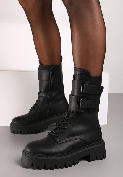 Czarne Botki Workery na Grubej Podeszwie z Paskami na Rzep Sailita
