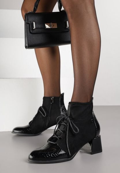 Czarne Botki Typu Trzewiki Vices na Słupku Ozdobione Lakierowanymi Elementami Adenella