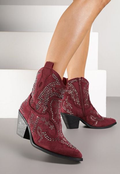 Bordowe Kowbojki Botki Ozdobione Cyrkoniami na Stożkowym Słupku Tulmira