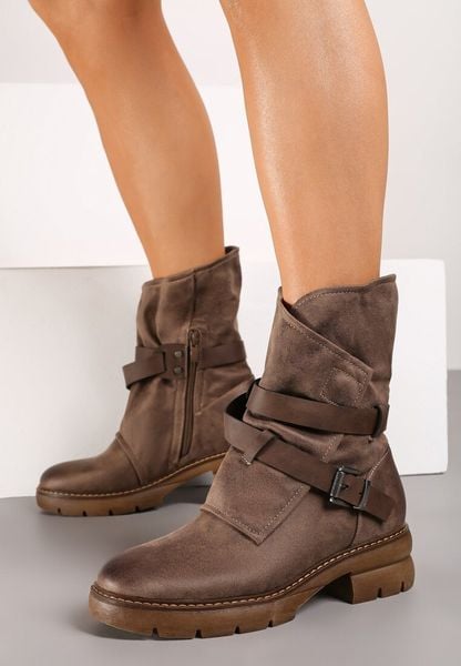 Ciemnobeżowe Botki z Nieregularną Cholewką Zdobioną Paskami i Sprzączkami Zinbelle