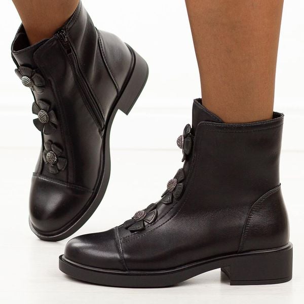 Czarne skórzane botki damskieto idealny wybór na chłodną jesień i zimę, łączący komfort, nowoczesny design i elegancję. Cholewka wykonana jest z wysokiej jakości skóry naturalnej, a jej wyjątkowy charakter podkreślają subtelne ozdoby w kształcie kwiatków, które dodają obuwiu kobiecego uroku. Botki są praktyczne dzięki zapięciu na suwak, a klasyczny okrągły nosek zapewnia wygodę noszenia. Wnętrze wykończone […]
