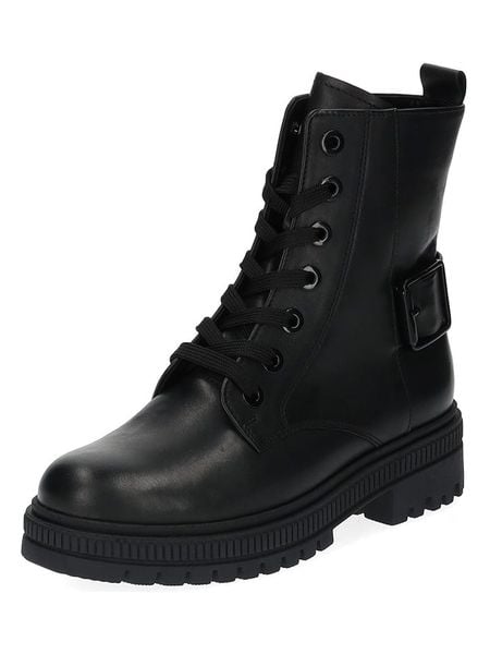 – skóra licowa- zapięcie: sznurowanie z bocznym suwakiem- praktyczna szlufka ułatwiająca zakładanie- noski: zaokrąglone- noski i zapiętki: wzmocnione- detale: ozdobna klamra- forma obcasa: blokowy- podeszwa: antypoślizgowa