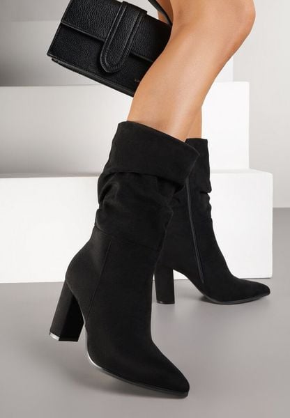 Czarne Marszczone Botki z Imitacji Zamszu na Słupkowym Obcasie Leriline